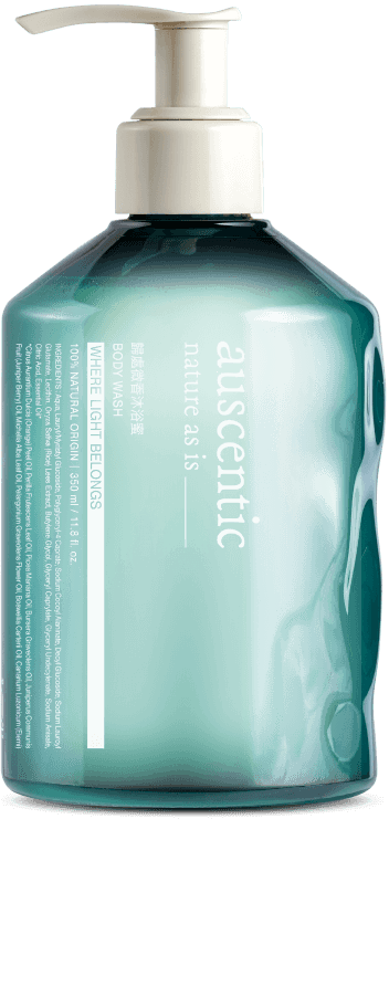 關於沐浴,我們理想中的泡沫必須是 100% 天然來源、豐盈而紮實、溫和帶有張力,洗淨後能直接感受肌膚需要的保護力。因此在綠藤原先 99.6% 天然來源的潔凈配方上,auscentic 添加了 0.4% 的天然,以及: